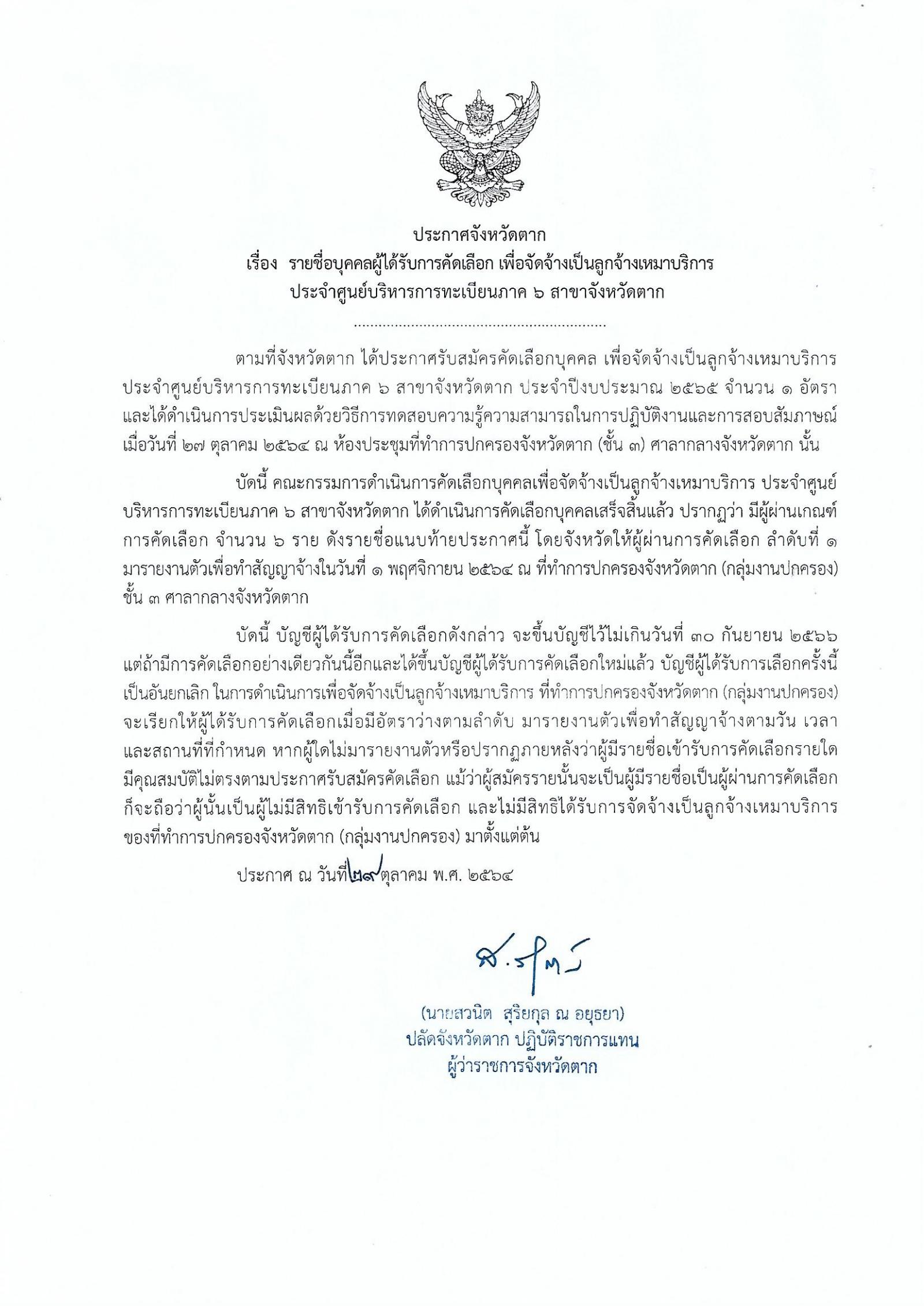 ประกาศจังหวัดตาก เรื่อง รายชื่อบุคคลผู้ได้รับคัดเลือก เพื่อจัดจ้างเป็นลูกจ้างเหมาบริการ ประจําศูนย์บริหารการทะเบียนภาค 6 สาขาจังหวัดตาก